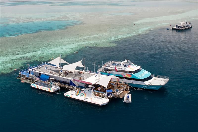 リーフワールドはハミルトン島近くのハーディ・リーフに係留された浮島(ポンツーン)のことで、ここを拠点にシュノーケリングやダイビングなどを楽しみます。