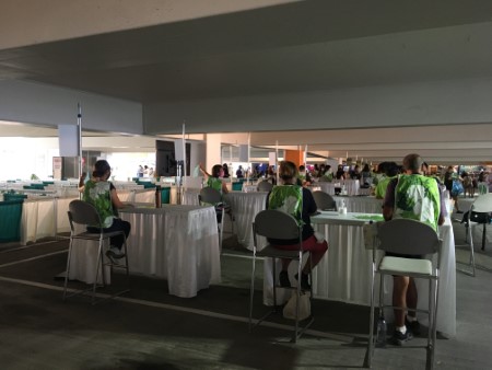 ぐねぐねと長い通路を歩いて行って、入口の係の人に「何番に行きなさい!」と言われ、そこに行って、ワクチン接種カードとIDの確認、そして、入場券(QRコード)を提示して、リストバンドを貰います。