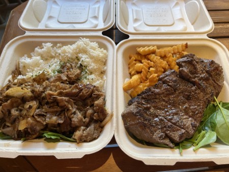 左側、甘辛く牛丼のような「焼肉プレート」$12.80-