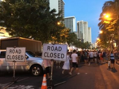 丁度、シーサイド・アベニューの所からカラカウア大通りは、通行止めです。