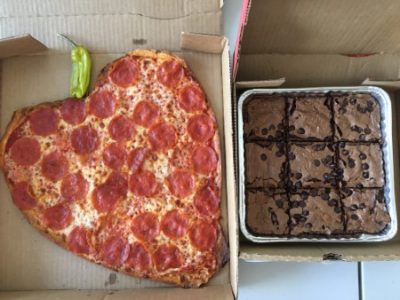 女性スタッフばかりの当社のオフィスでは、今日は、バレンタインデーということで、男性マネージャーがハート型のピザとブラウニーをランチに注文してくれました。